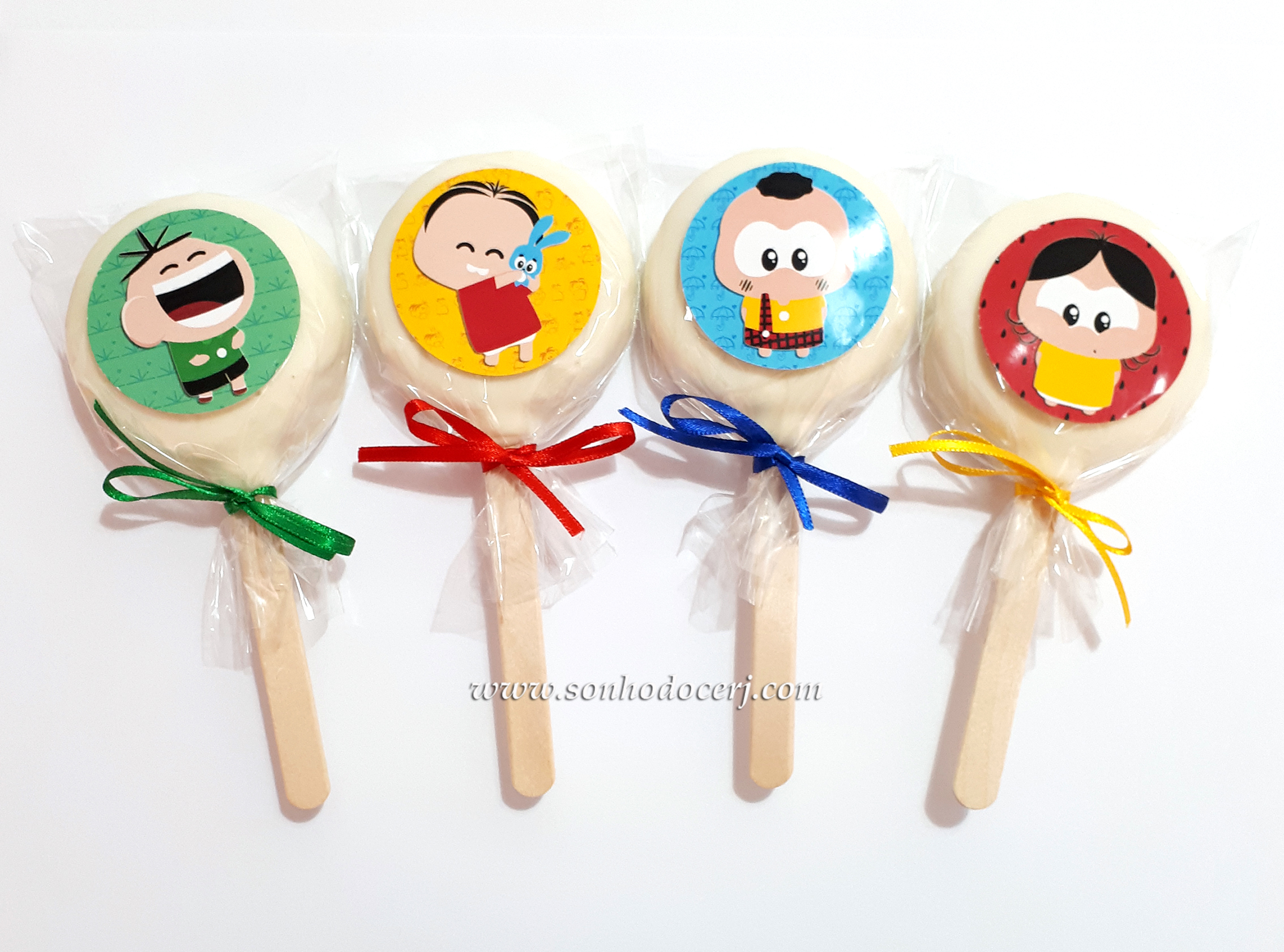 Pirulito de biscoito com rótulo personalizado no tema “Turma da Mônical”!