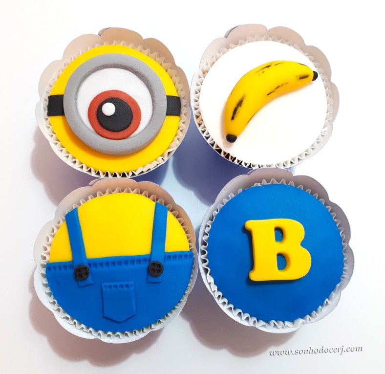 Cupcakes Minions! Banana (7,00), Letra (6,00), Olho Minion (8,00), Roupa Minion (8,00)