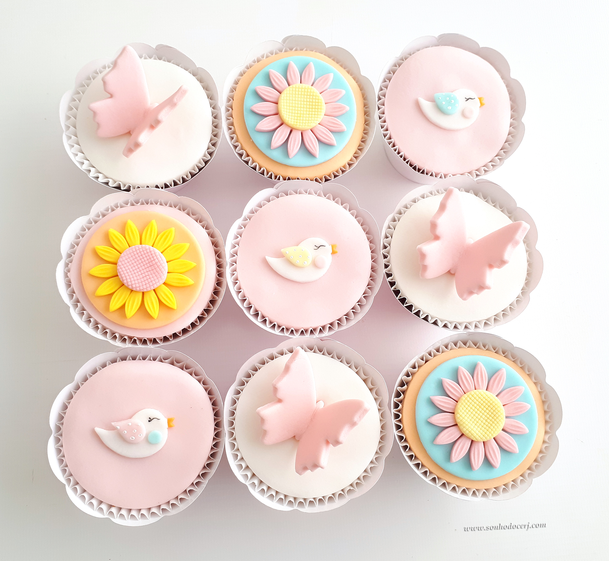 Cupcakes “Jardim”! Margarida estilizada com fundo redondo (12,00), Borboleta grande 3D (13,00), Passarinho com fundo liso (12,00)