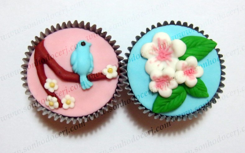 Cupcakes! Passarinho no galho com flores (D), Trio de flores com folhas (E)