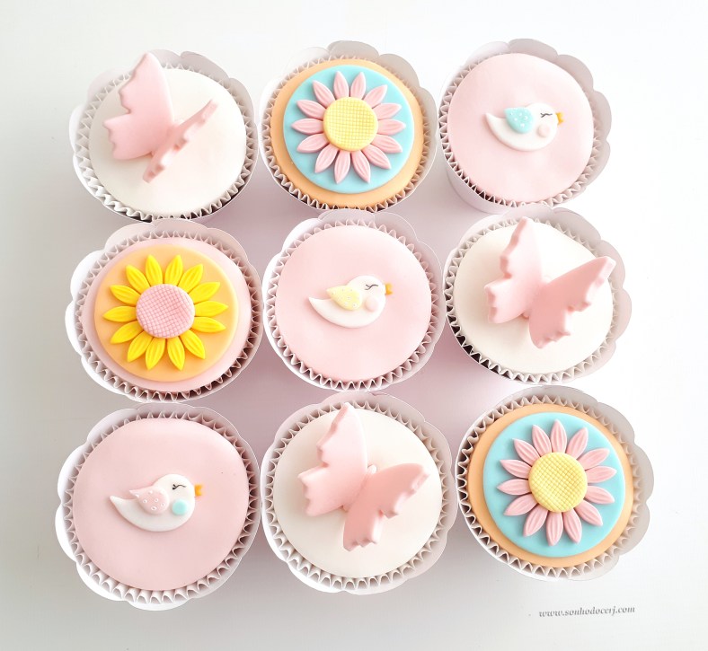 Cupcakes “Jardim”! Margarida estilizada com fundo redondo (9,00), Borboleta grande 3D(9,00), Passarinho com fundo liso (9,00)