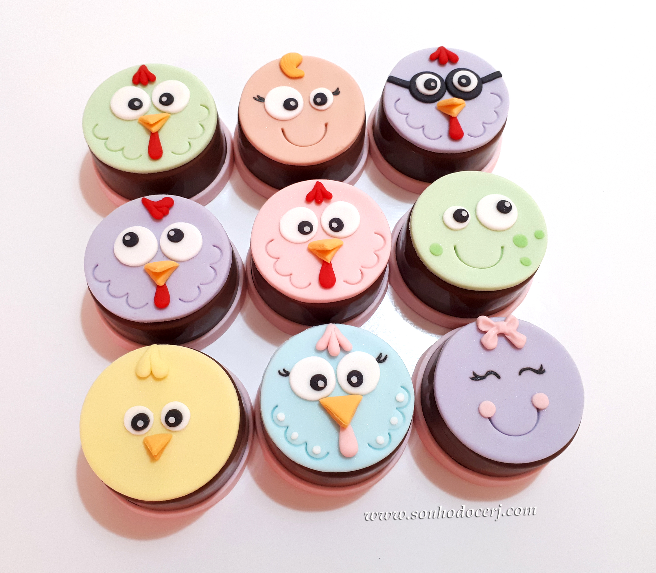 Cupcakes Galinha Pintadinha em candy colors! Pintinho (11,00), Galinha Pintadinha (11,00), Borboletinha (11,00), Galo (11,00), Galinha rosa (11,00), Sapo (11,00), Galinha Verde (11,00), Baratinha (11,00), Galinha roxa de óculos (11,00)