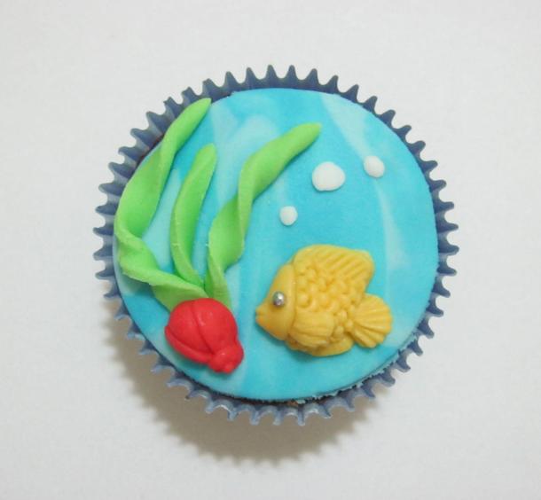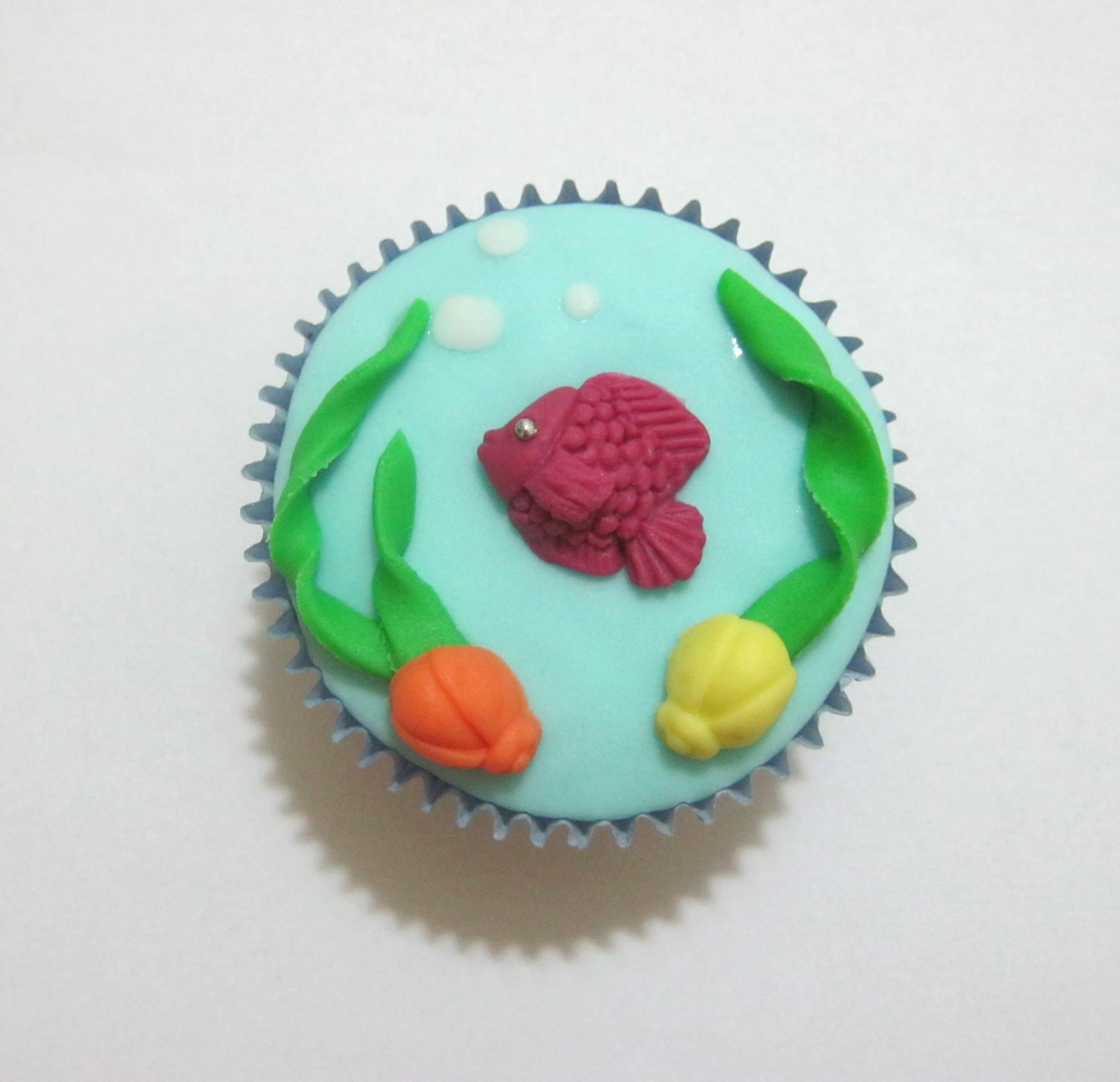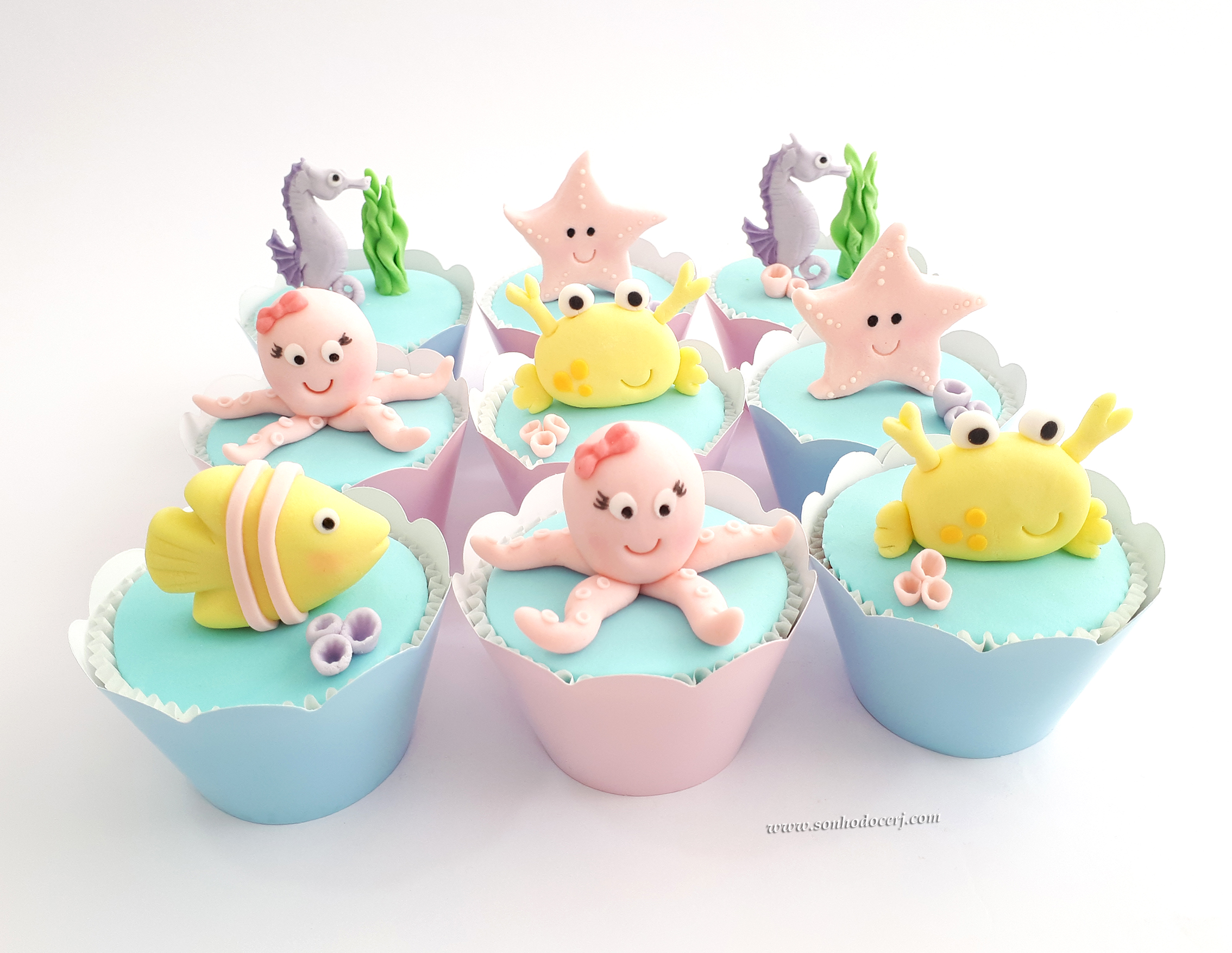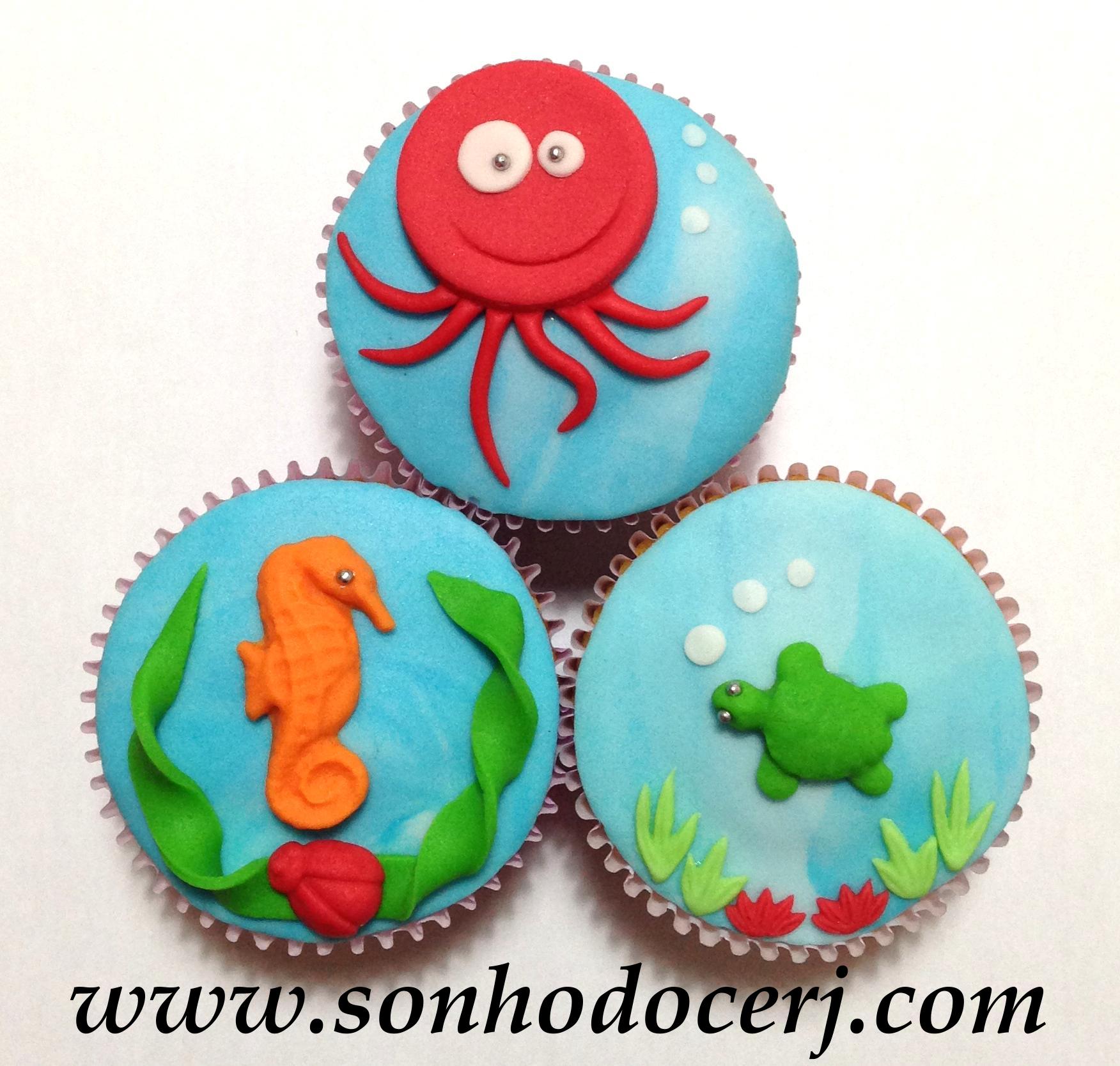 Cupcakes “Fundo do mar”! Peixe 3D (19,00), Polvo 3D (19,00), Caranguejo 3D (19,00), Estrela do mar 3D (19,00), Cavalo marinho 3D (19,00)