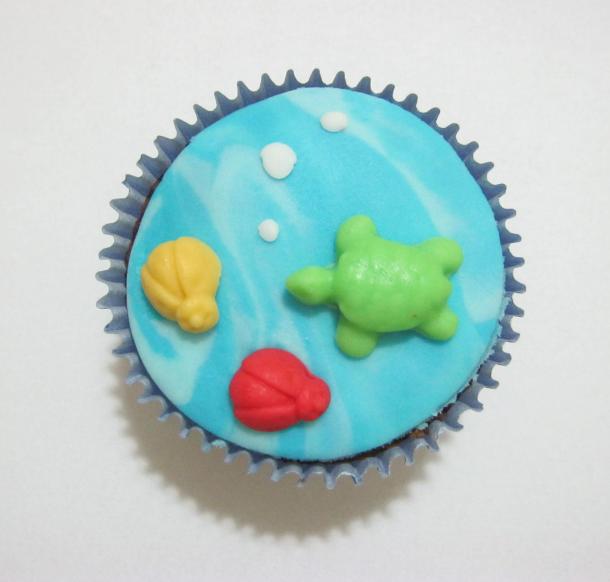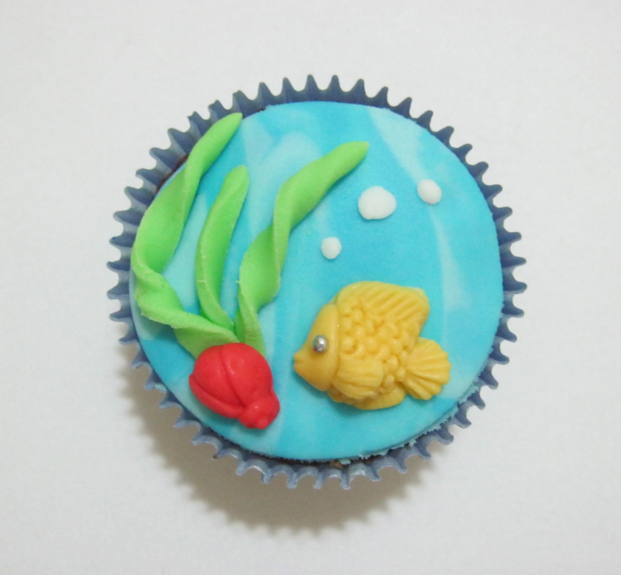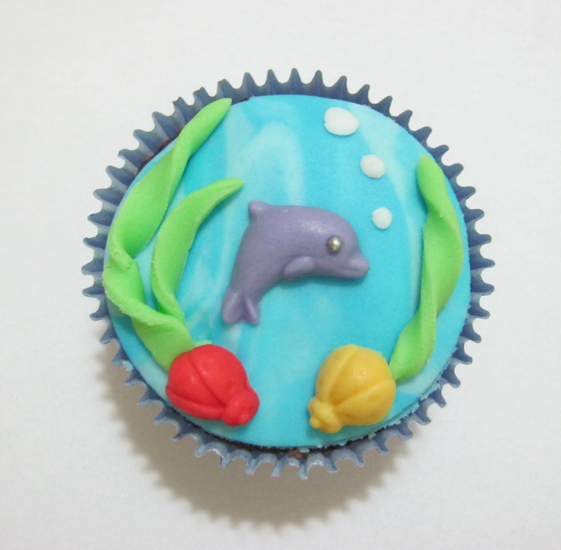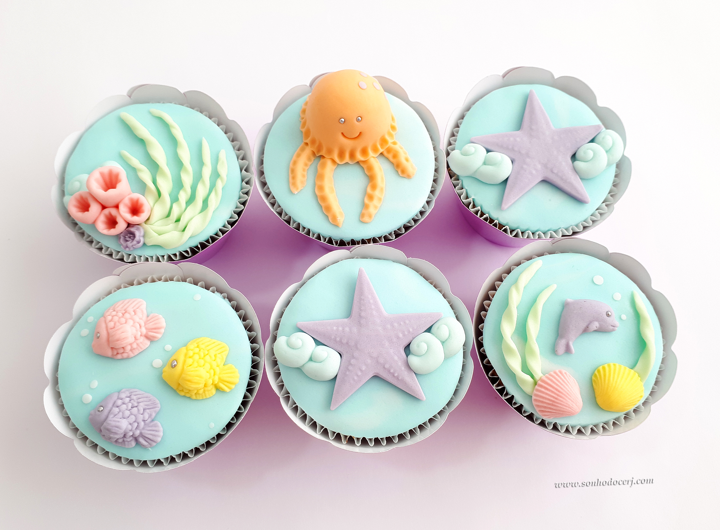 Cupcakes “Fundo do Mar”! Trio de peixinhos (11,00), Estrela do Mar com conchas (11,00), Golfinho (13,00), Corais (13,00), Água viva (15,00)