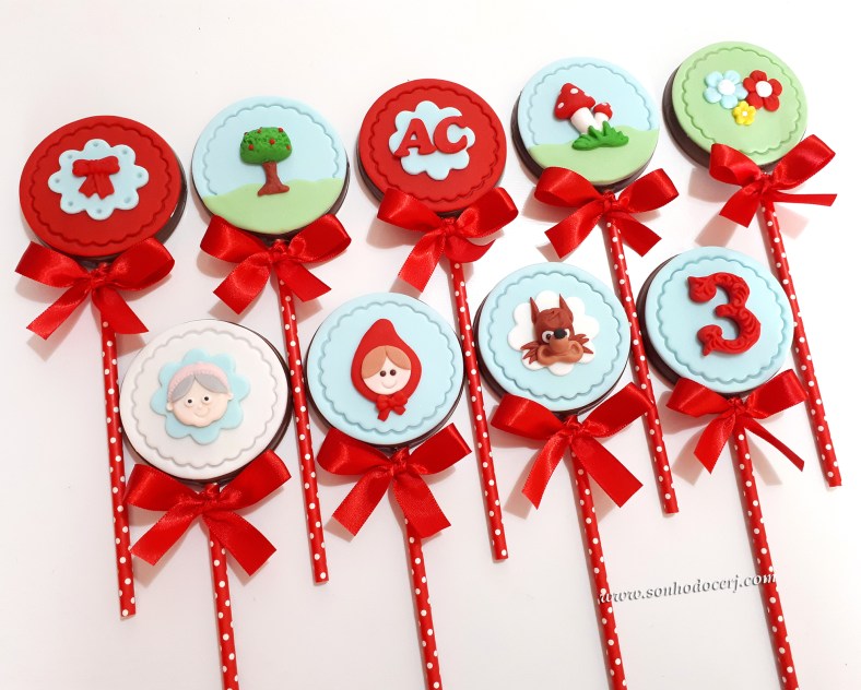 Pirulitos de chocolate “Chapeuzinho Vermelho”! Vovó (8,00), Chapeuzinho Vermelho (8,00), Lobo (8,00), Número com textura (5,00), Lacinho com fundo flor (5,00), Árvore (7,00), Letra ou número com fundo flor (5,00), Cogumelos (7,00), Trio de flores (6,00)