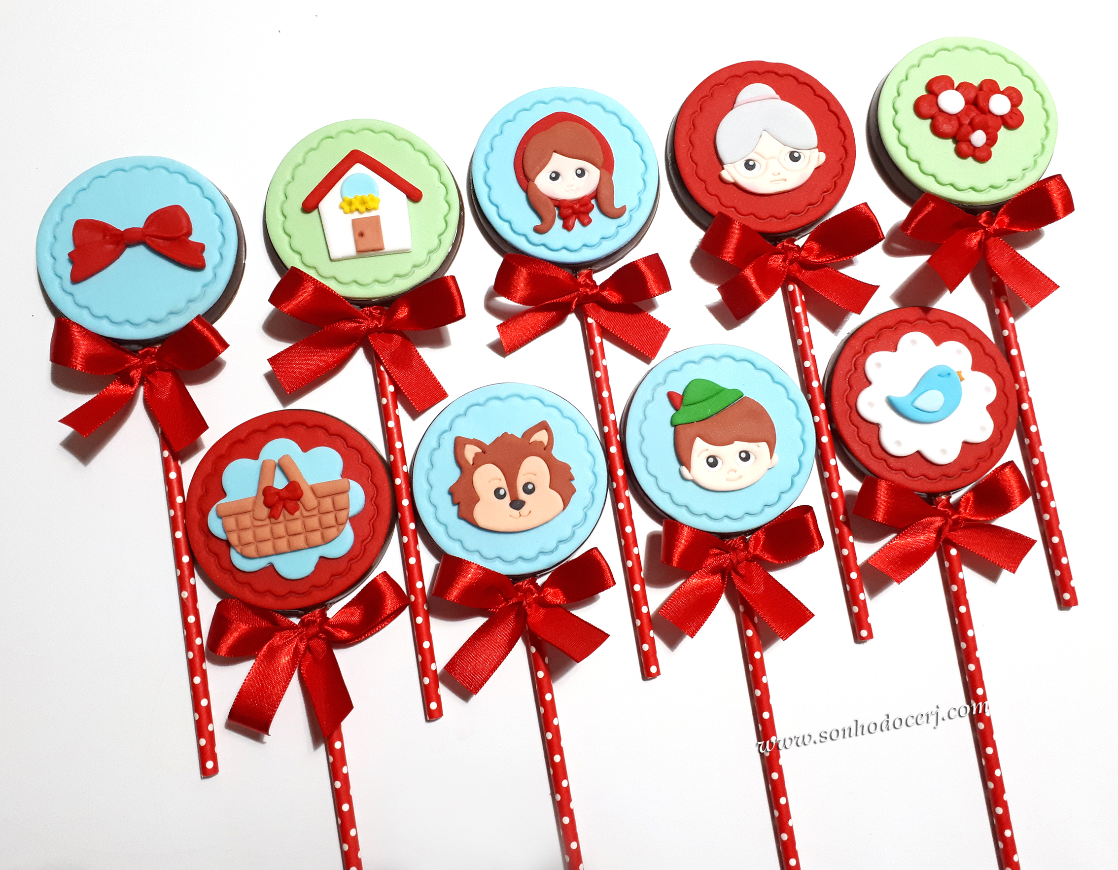 Pirulitos de chocolate “Chapeuzinho Vermelho”! Laço grande (5,00), Casa da vovó (7,00), Chapeuzinho vermelho com cabelo preso (8,00), Vovó (8,00), Trio de flores cor única (5,00), Cestinha plana (6,00), Lobo plano (8,00), Caçador (8,00), Passarinho (6,00)