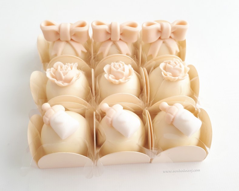 Bombom arredondado “Chá de bebê”! Mamadeira (7,50), Rosa (7,50), Laço 3D (8,50)