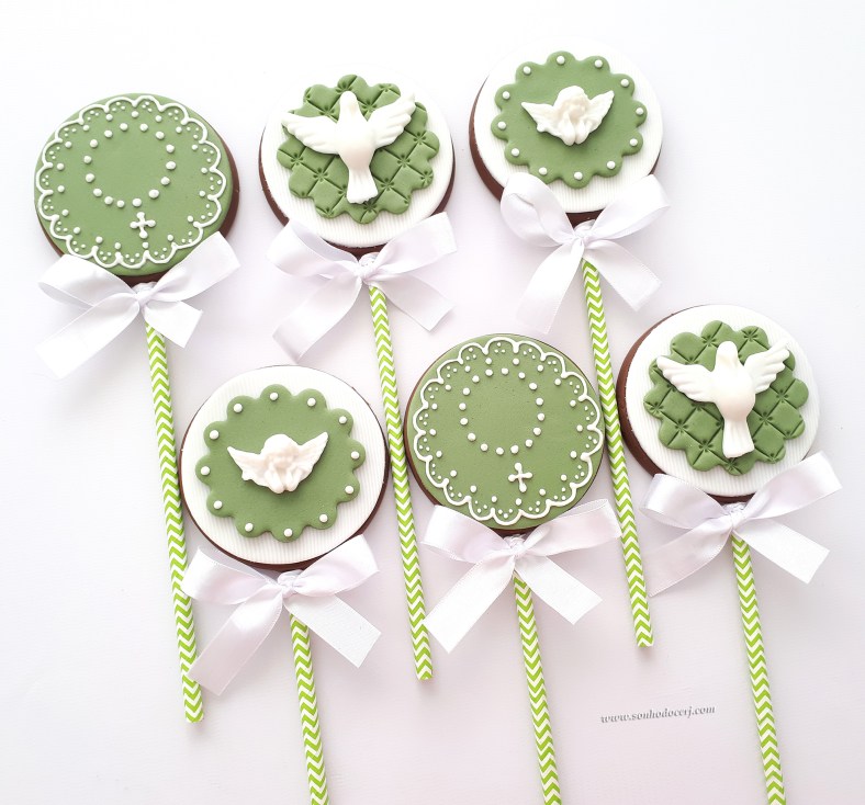 Pirulitos de chocolate “Batizado”! Anjinho branco com fundo escalopado (7,00), Terço em glacê branco (9,00), Pombinha branca grande com fundo matelassê (7,00)