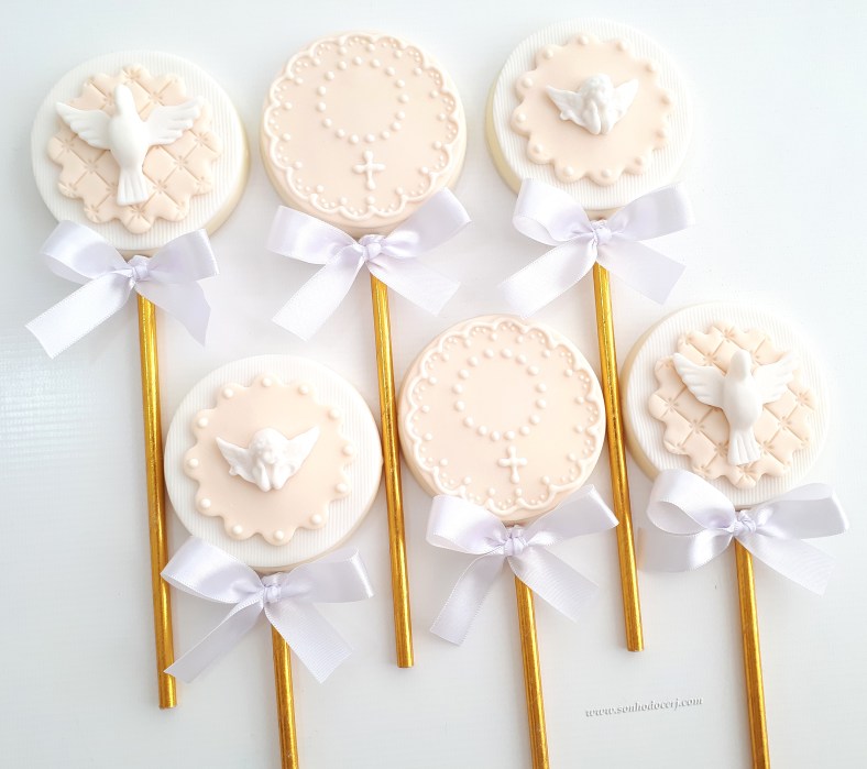 Pirulitos de chocolate “Batizado”! Anjinho branco com fundo escalopado (8,00), Terço em glacê branco (12,00), Pombinha branca grande com fundo matelassê (8,00)