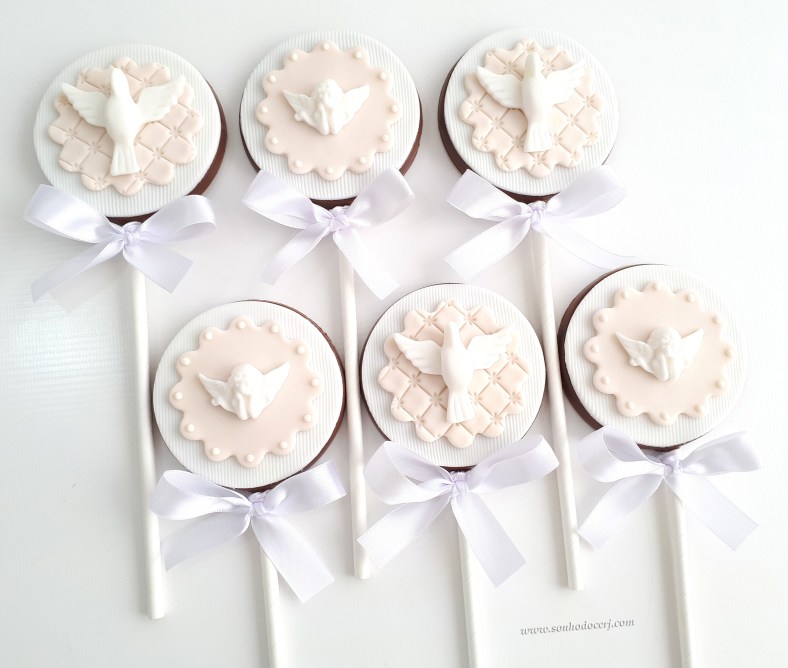 Pirulitos de chocolate “Batizado”! Anjinho branco com fundo escalopado (8,00), Pombinha branca grande com fundo matelassê (8,00)