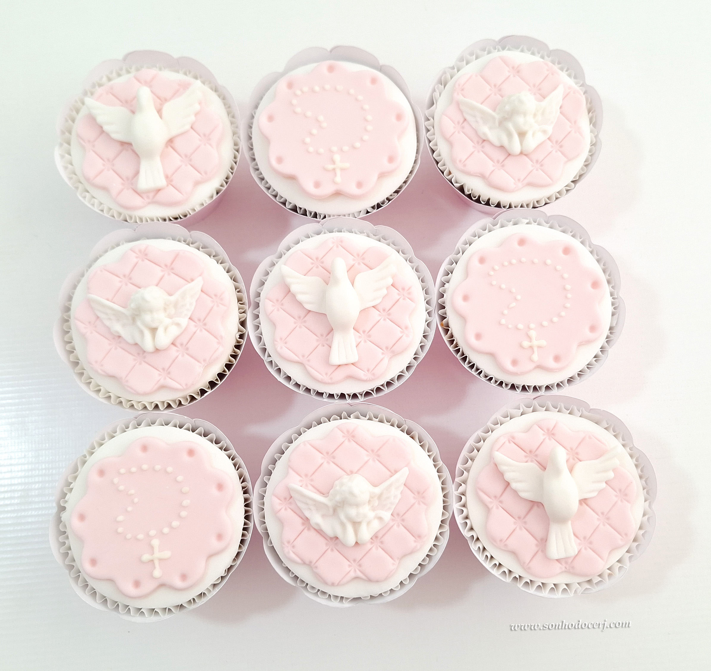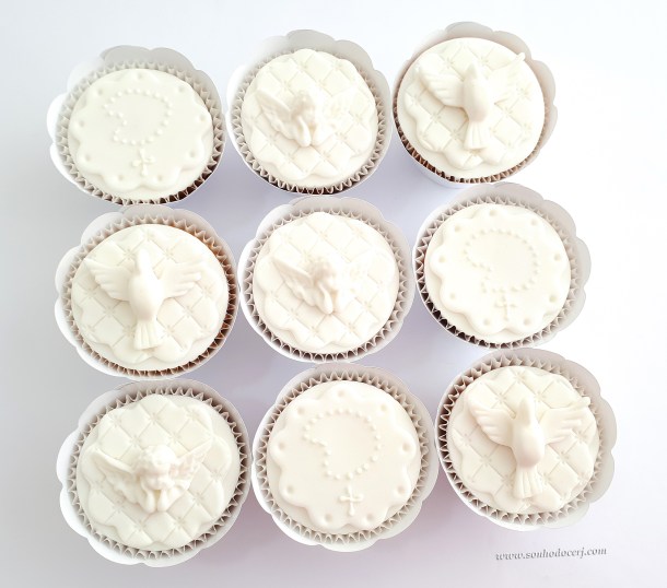 Cupcakes Batizado / 1ª Comunhão! Pombinha branca grande com fundo matelassê (11,00), Anjo branco com fundo matelassê (11,00), Terço em glacê branco com fundo flor grande (13,00)