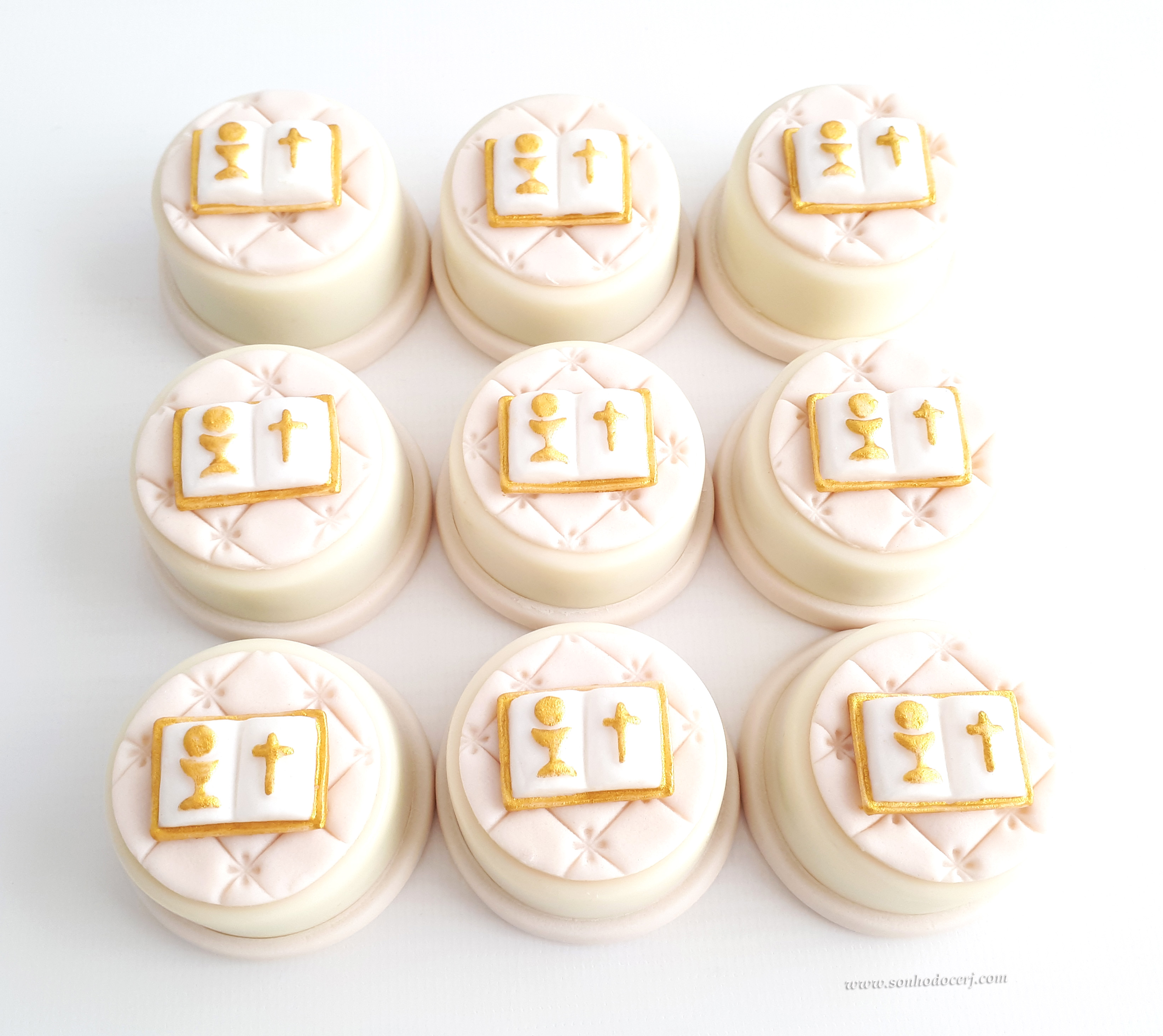 Doces decorados para Batizado! Mini pão de mel redondo detalhe dourado (11,00), Pão de mel em formato de Bíblia anjo dourado (19,00), Bombom anjinho 3D (18,00)