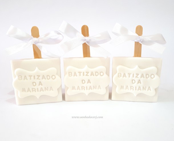 Pirulitos de chocolate “Batizado”! Pombinha branca grande com fundo matelassê (10,00)