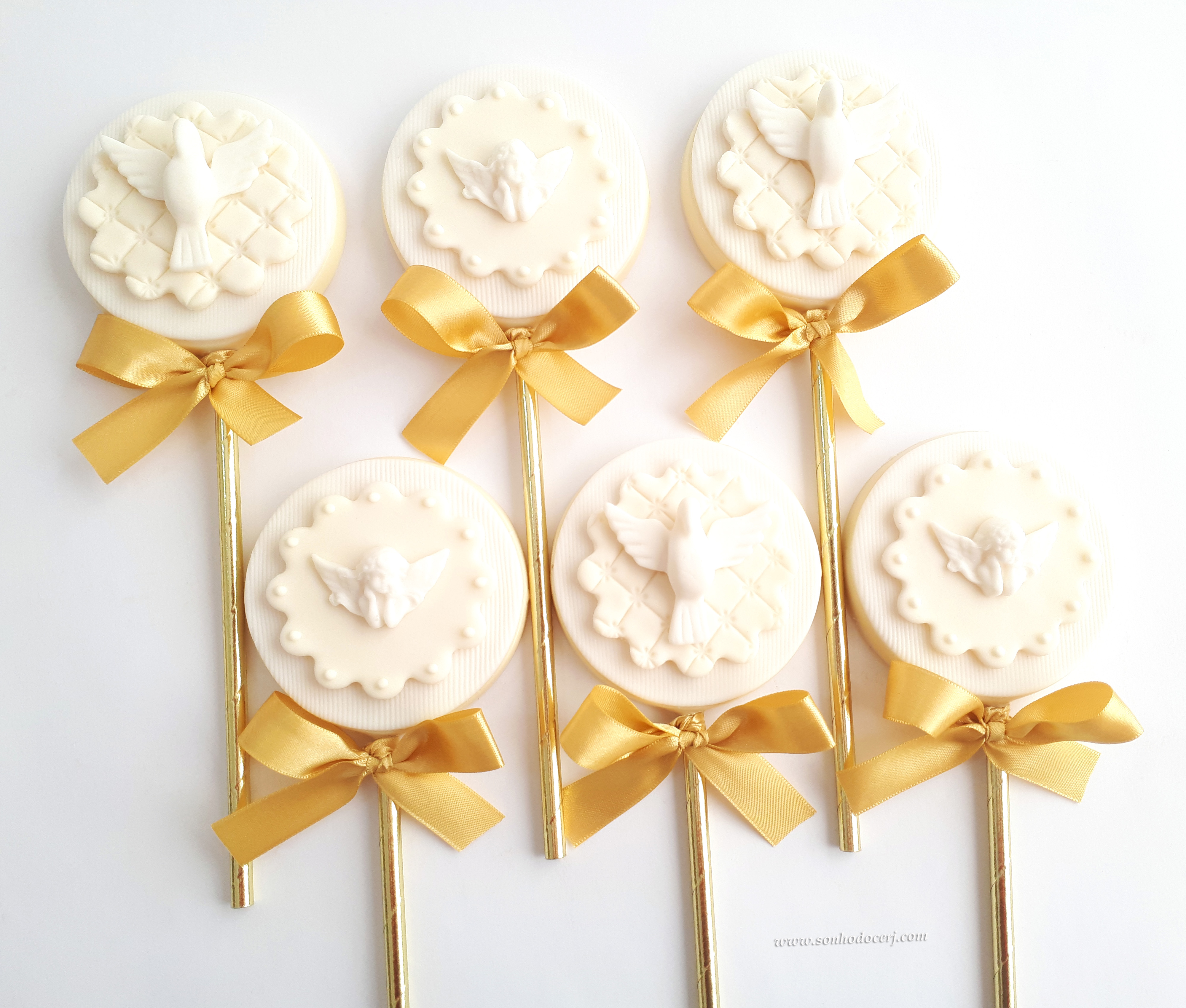 Doces decorados para Batizado! Pão de mel redondo (Anjinho barroco (13,00) / Pombinha branca (13,00)), Pão de mel no palito (Placa com escrito (16,00)), Bombom anjinho 3D (18,00)