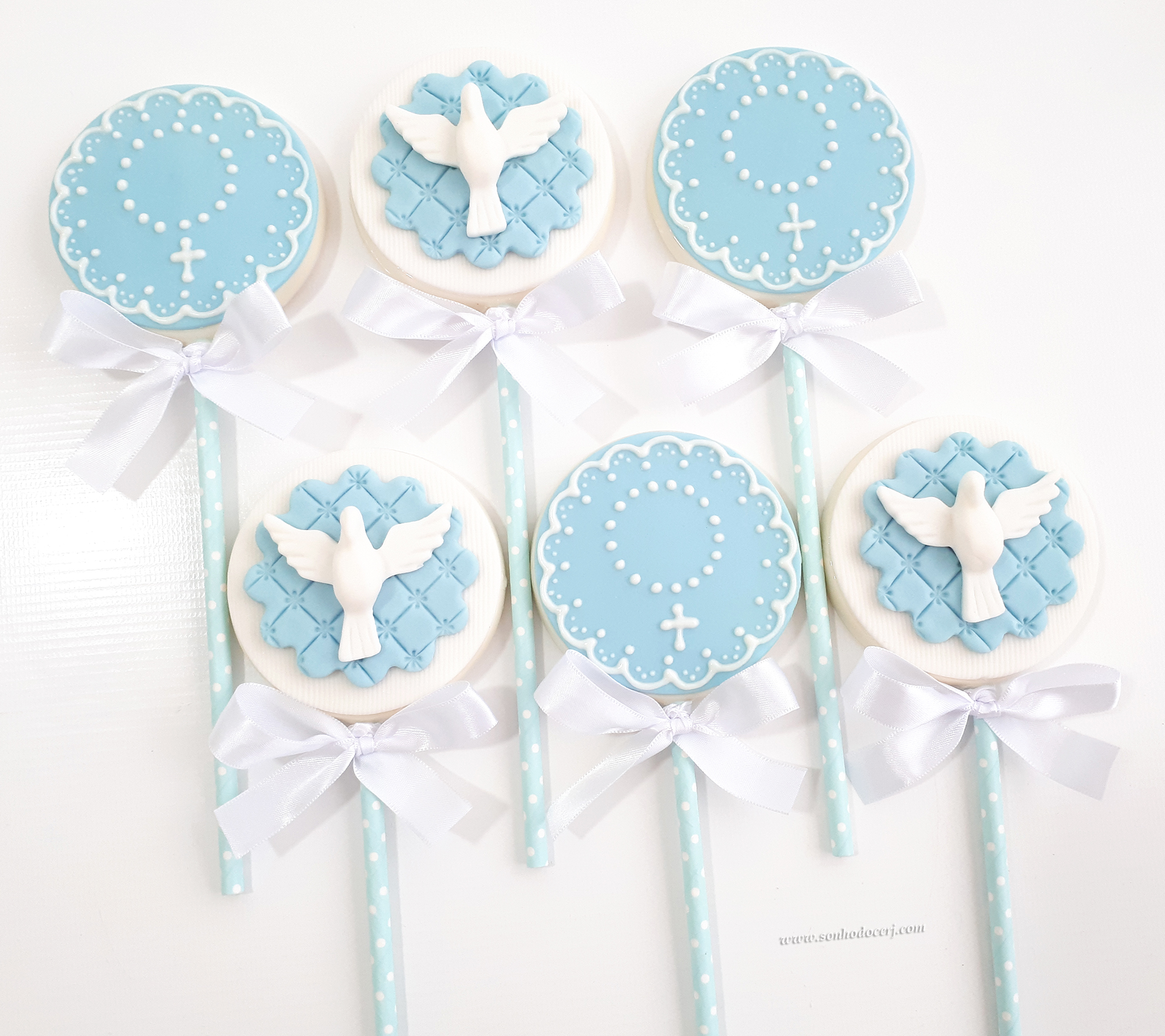 Pirulitos de chocolate “Batizado”! Pombinha branca grande com fundo matelassê (10,00), Terço em glacê branco (15,00)