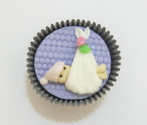 Cupcakes “Chá de bebê”! Botões com fundo matelassê (13,00), Coração com fundo floral (11,00), Carrinho de bebê com fundo flor e bolinhas prateadas (14,00), Cegonha com fundo redondo (13,00)
