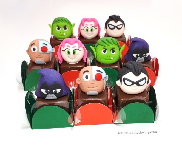 Pirulitos de chocolate “Jovens Titãs”! Estelar (15,00), Robin (15,00), Mutano (15,00), Ciborgue (15,00), Ravena (15,00)