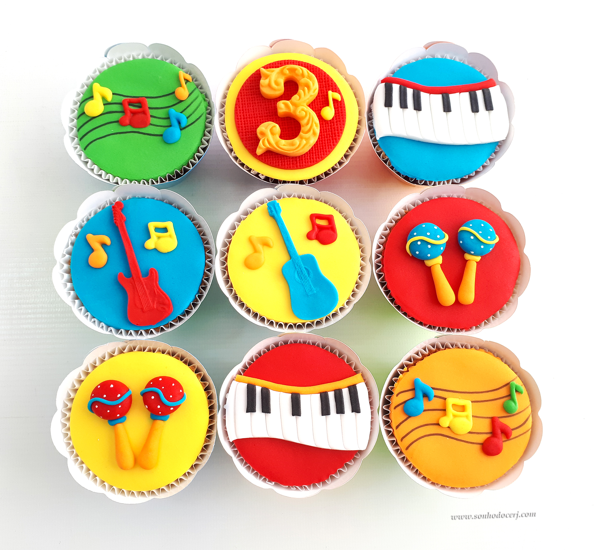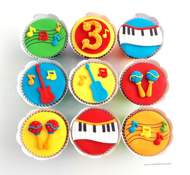 Cupcakes “Música”! Chocalhos (14,00), Teclado (14,00), Notas musicais coloridas (11,00), Guitarra com notas musicais (12,00), Violão com notas musicais (12,00), Número com nota musical (12,00)