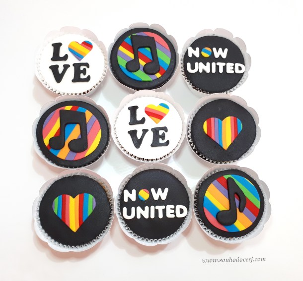Cupcakes “Now United”! Coração listras coloridas (12,00), Escrito Now United (14,00), Nota musical com fundo listras coloridas (13,00), Escrito Love com coração colorido (13,00)