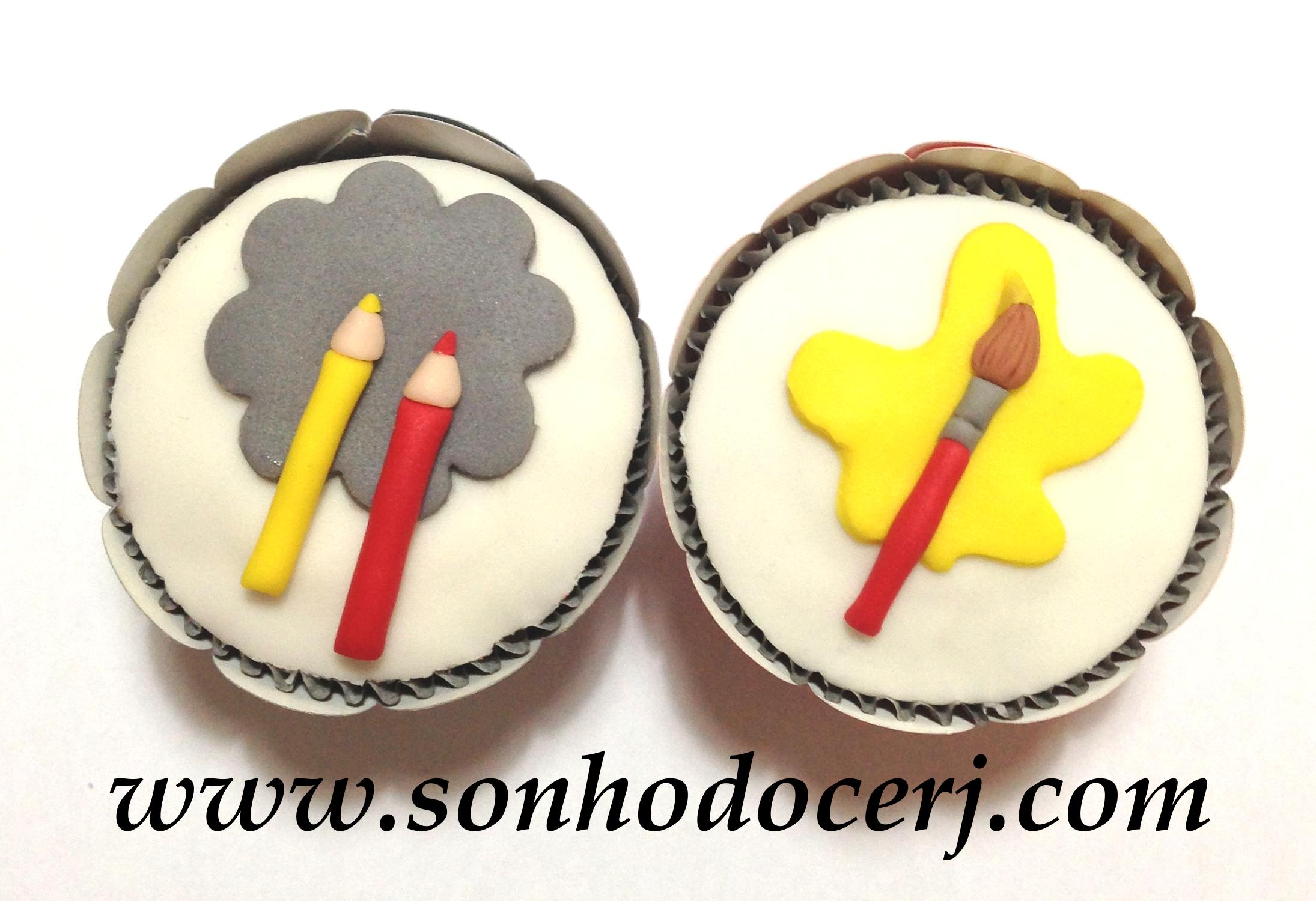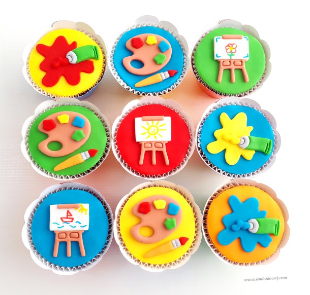 Cupcakes “Pintando o sete”! Cavalete com tela (14,00), Paleta de tinta (14,00), Tubo de tinta (12,00)