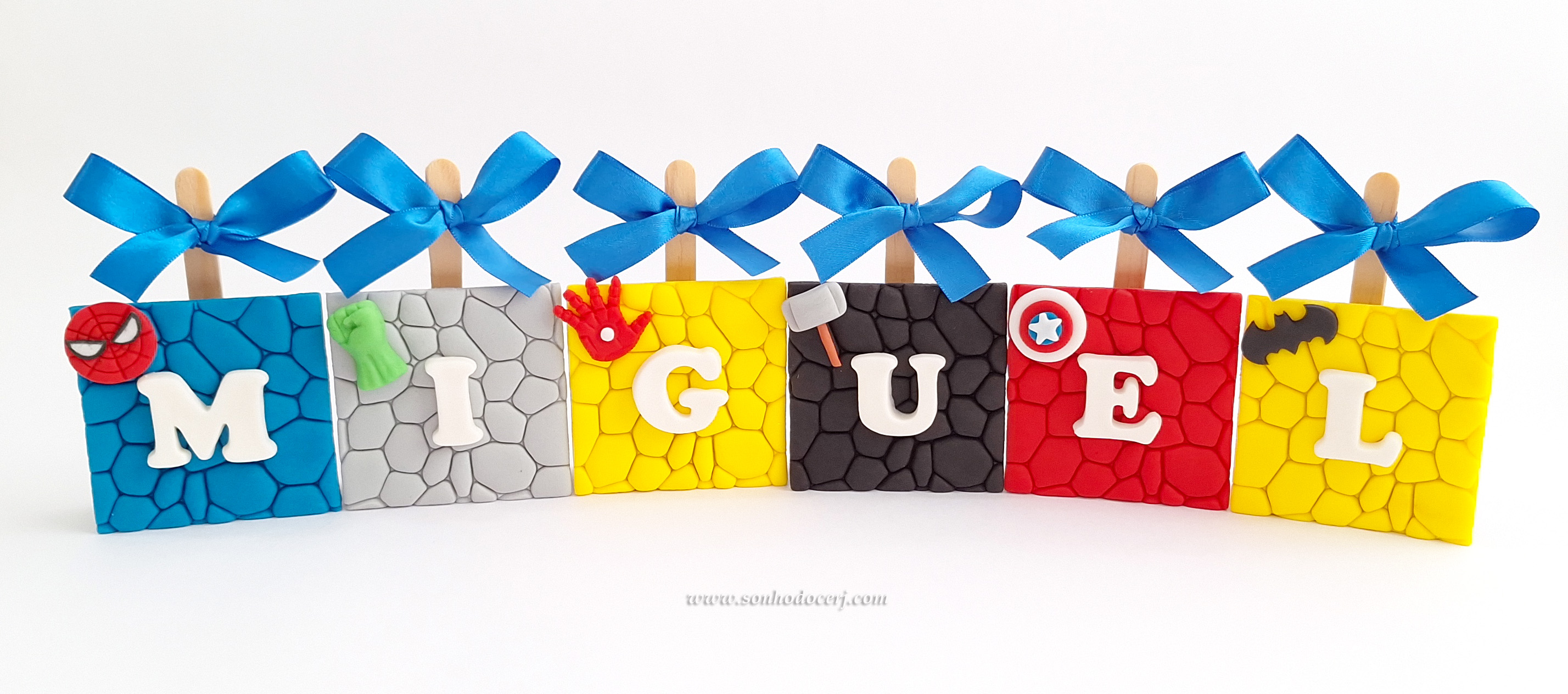 Pão de mel no palito “Super-heróis”! Letra ou número com símbolo do super-herói (Homem-aranha, Hulk, Homem de ferro, Thor, Capitão América, Batman) (16,00)