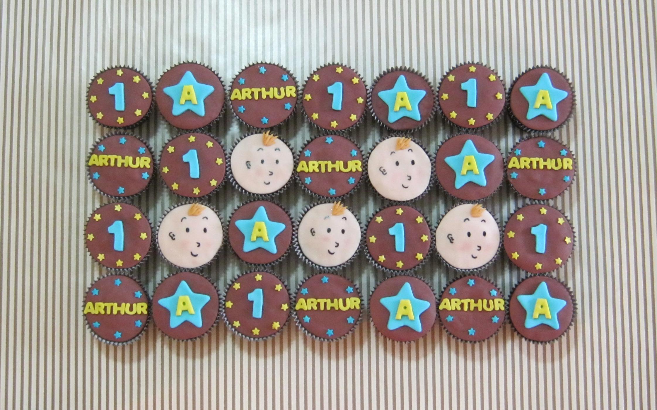 Cupcakes Marrom, Azul e Amarelo para a festa do Tintim!! (Tintim (14,00), Nome com estrelas (14,00), Inicial com estrela (10,00), Número com estrelas (11,00))