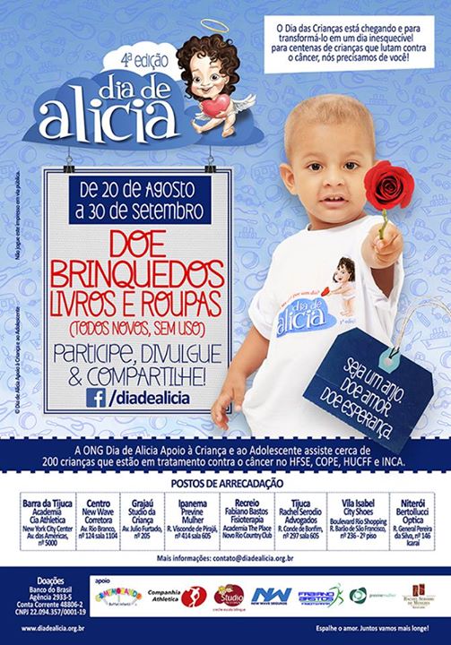 Aguardada por cerca de 200 crianças, a 4ª edição do Dia de Alicia, que acontecerá em outubro deste ano, iniciará na próxima quinta-feira sua campanha de arrecadação de brinquedos, livros infanto-juvenis e roupas (todos novos, sem uso), para fazer desta edição mais um dia mágico e repleto de amor.